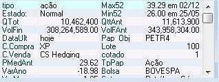 Mini Gráfico: Mostra um mini gráfico intraday com os ícones ID e LP que quando clicados, abrem janelas com os gráficos Intraday e Longo Prazo respectivamente.