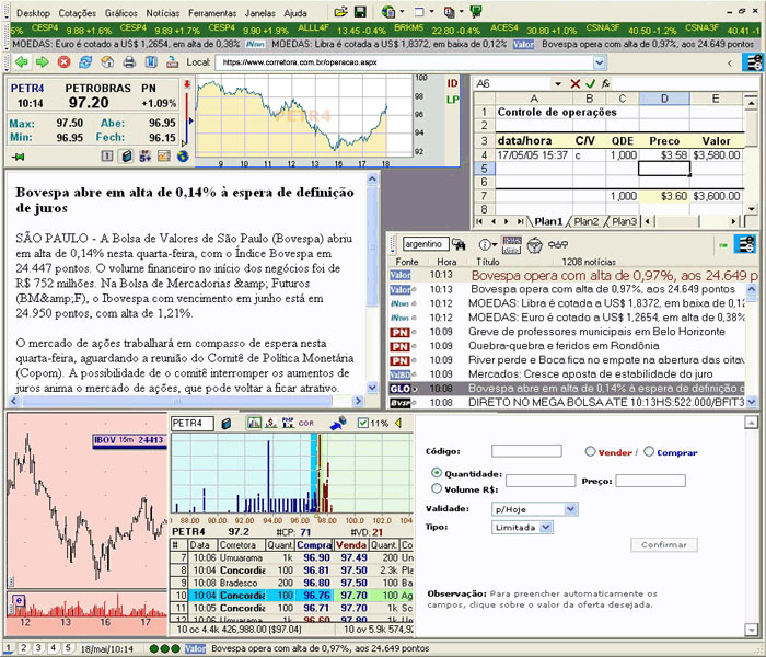No desktop abaixo temos um exemplo, incluindo página de notícia, página para negociação eletrônica e planilha Excel.