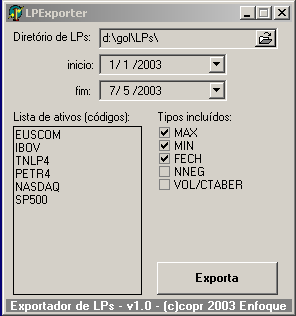 Utilitário LPExporter - exportação de LPs Através do utilitário LPExporter, você pode exportar valores de séries históricas de preços Enfoque (séries LPs). O programa exporta um ou mais ativos para para um único arquivo de texto (*.txt). Isso permite a importação para Excel e outros programas que aceitem texto. O arquivo LPExporter.zip, que contém o programa LPExporter.exe, pode ser baixado aqui . Instruções de instalação: